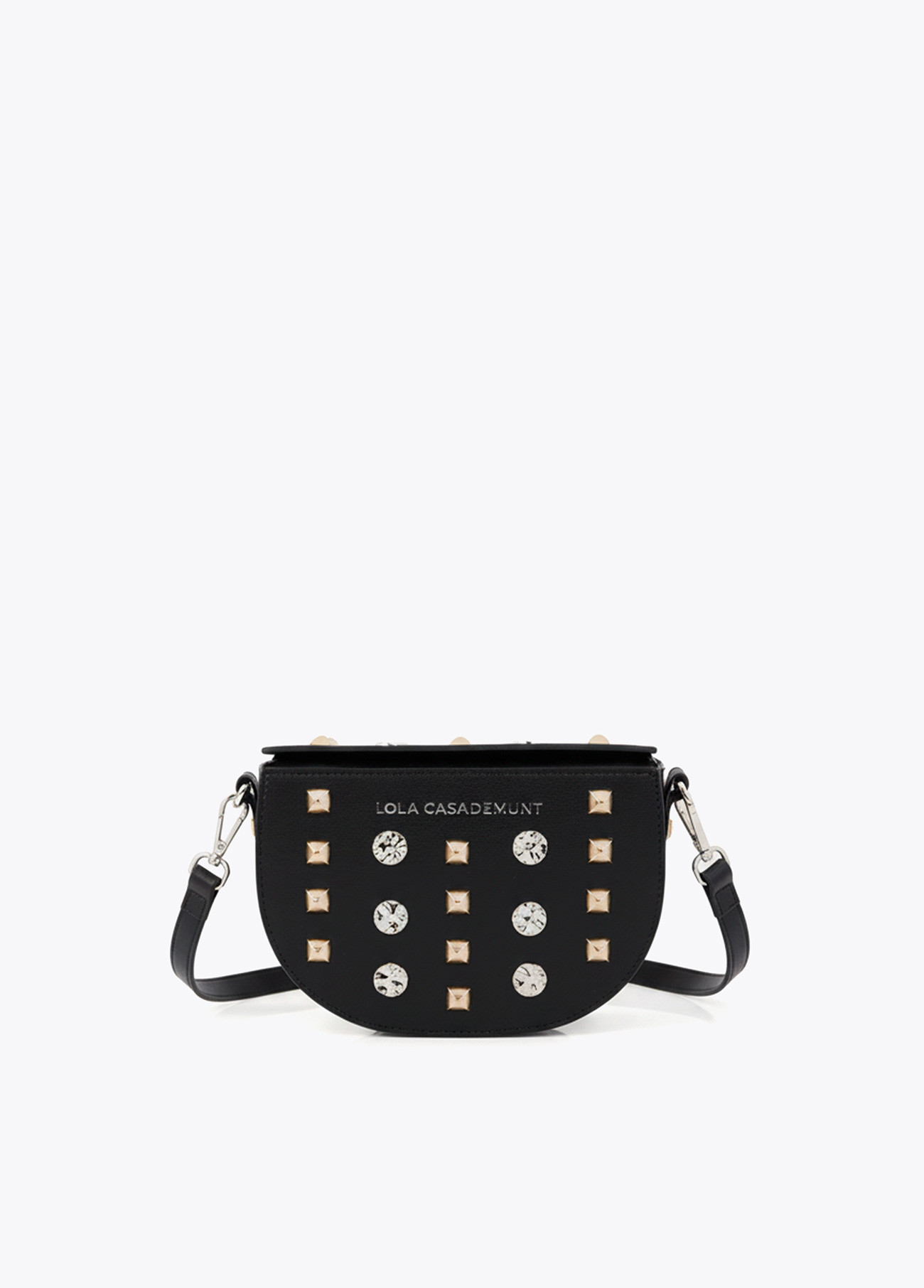Bandolera de diseño moderno con tachas doradas y brillantes. Fabricada en material sintético de alta calidad. Cierre magnético y correa ajustable para mayor comodidad. Perfecto para añadir un toque único a cualquier look.