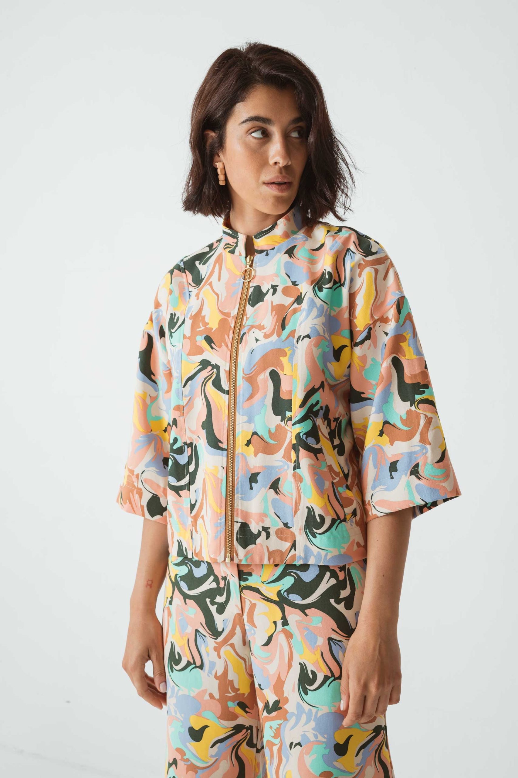 Chaqueta bomber suelta, cuello alto, mangas 3/4. Bolsillos delanteros. Tejido fluido de sarga de peso medio. Multicolor. La viscosa LENZING™ ECOVERO™ se fabrica mediante producción ecorresponsable con materias primas procedentes de bosques gestionados de forma responsable. Su producción genera un 50 % menos de gases con efecto invernadero y requiere la mitad de agua.