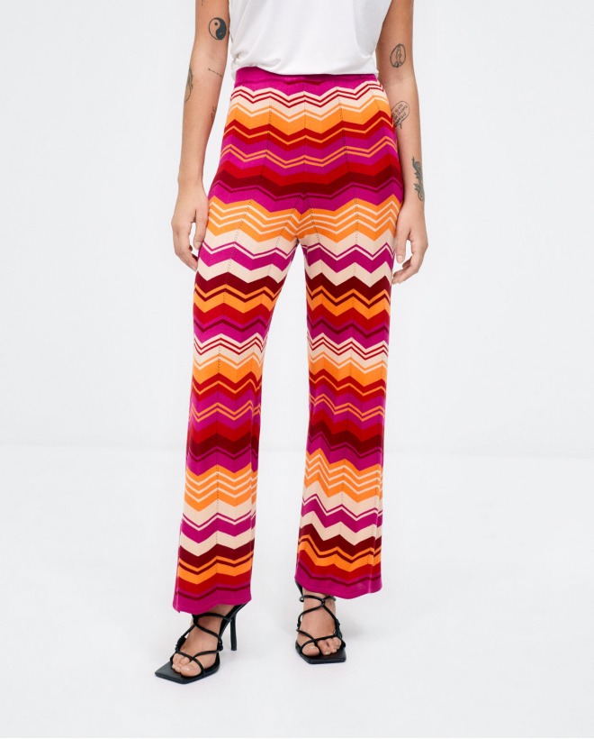 Pantalón largo recto de punto. A rayas en zigzag en tonos rojo, fucsia, naranja y blanco.