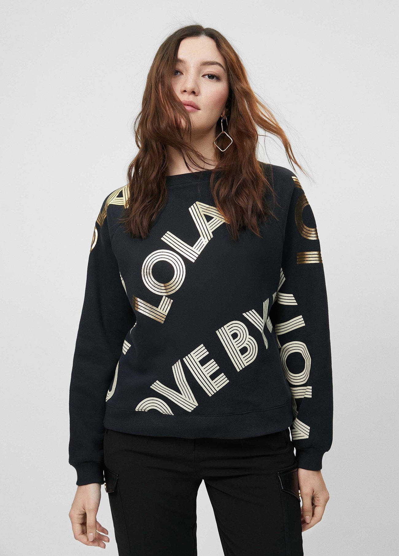 Sudadera gris con multilogos en color dorado y negro. Prenda de estilo sporty juvenil y de máxima tendencia.