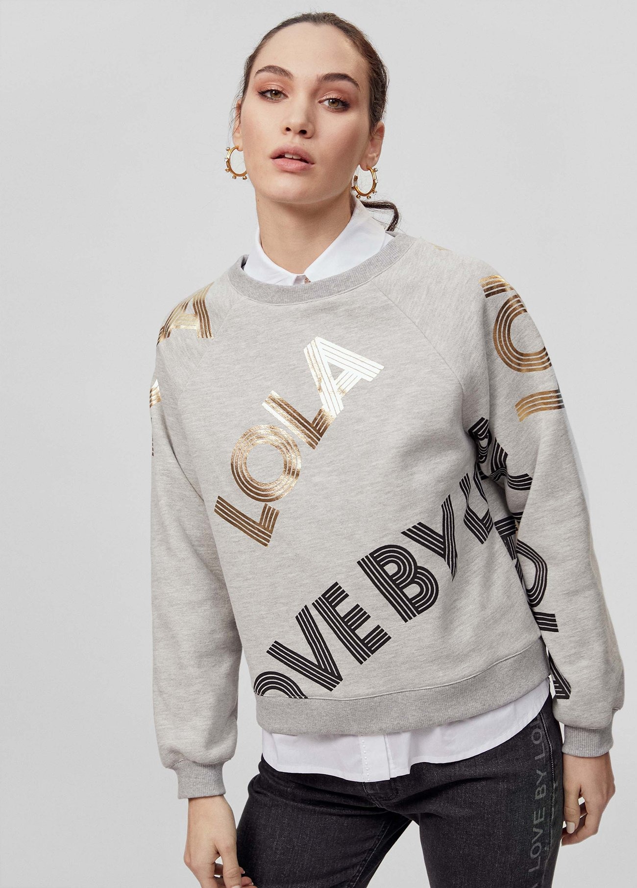 Sudadera gris con multilogos en color dorado y negro. Prenda de estilo sporty juvenil y de máxima tendencia.