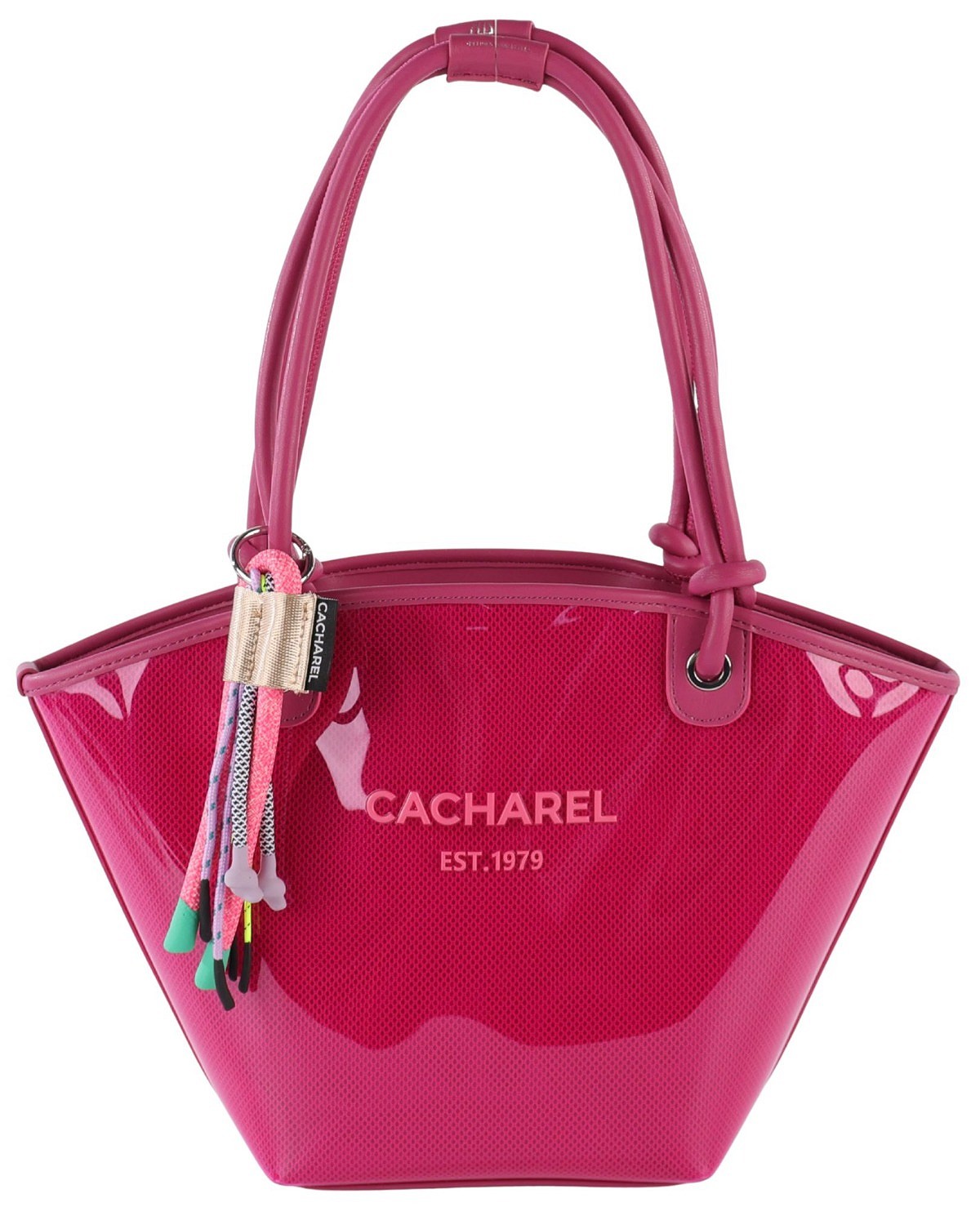 Cuenta con doble asa larga en el mismo tono magenta, con un diseño anudado que aporta un toque distintivo y permite llevarlo cómodamente al hombro. En la parte frontal destaca el logo de CACHAREL al tono, integrado de manera elegante y discreta.